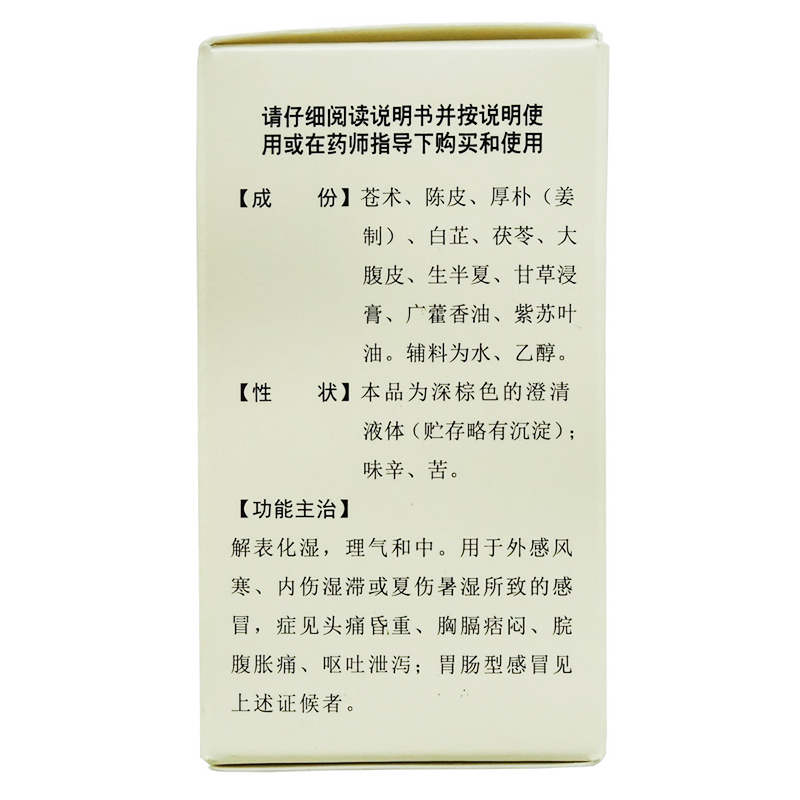 【主要成份】 苍术、陈皮、厚朴(姜制)、白芷、茯苓、大腹皮、生半夏、甘草浸膏、广藿香油、紫苏叶油。辅料为水、乙醇。